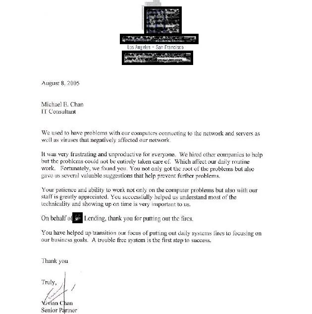 We needed a professional IT, and Michael was the one for us. Michael has made our office a top notch production machine! He made the best recommendations necessary for our needs and he has exceeded our expectations. He's been there when we are in a crunch, explains everything in detail and gives us the best value for our needs. Thank you Michael!